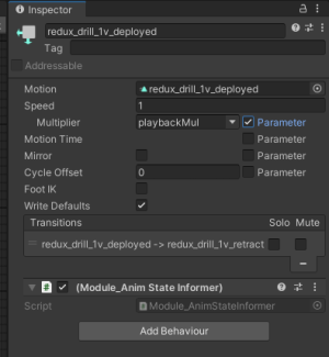 - Click on each state and in "Speed" > "Multiplier", select "Parameter". It should automatically display "playbackMul" in the dropdown. This is for playing the animation ten times faster in the VAB.