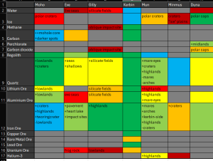 This table lists all elements mentionned in the KSP2 Surface Survey flavor texts.
