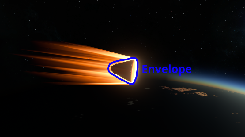 Picture of a capsule reentering Kerbin's atmosphere in KSP2 with the effect envelope highlighted.